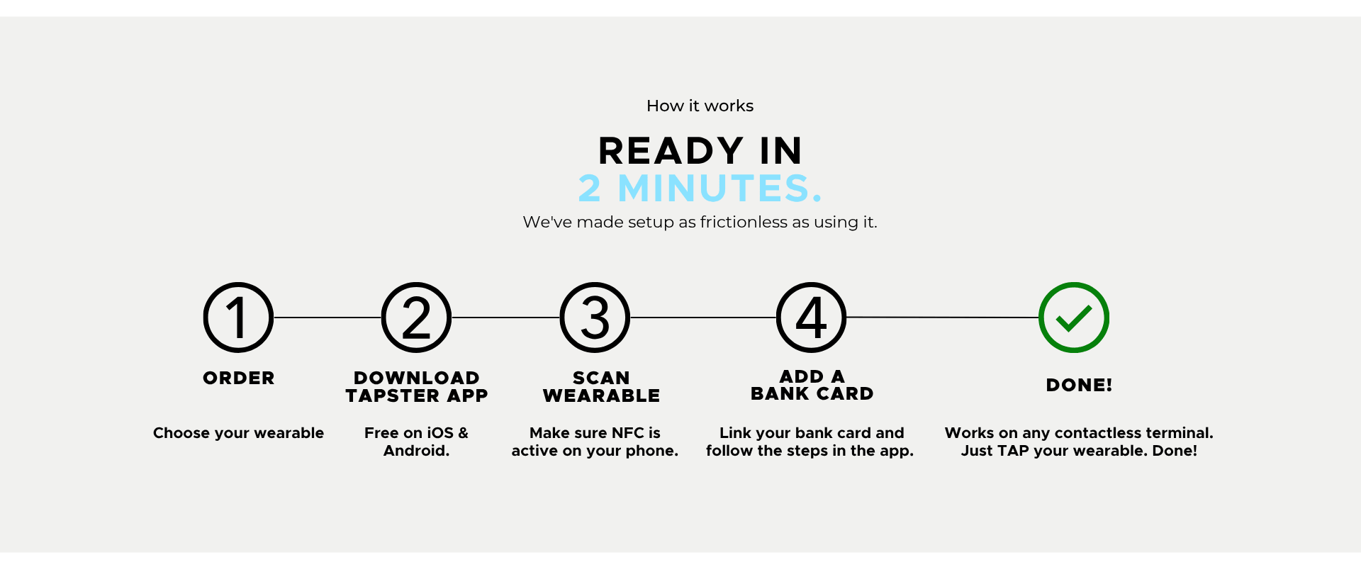 You know how you TAP your bank card or phone to pay at a shop? Tapster puts that exact same technology into beautiful jewellery rings, bracelets, keyrings, watch straps. The chip inside links to your existing bank account. Just hold wearable near any contactless reader and the payment goes through. No battery. No charging. No app open.